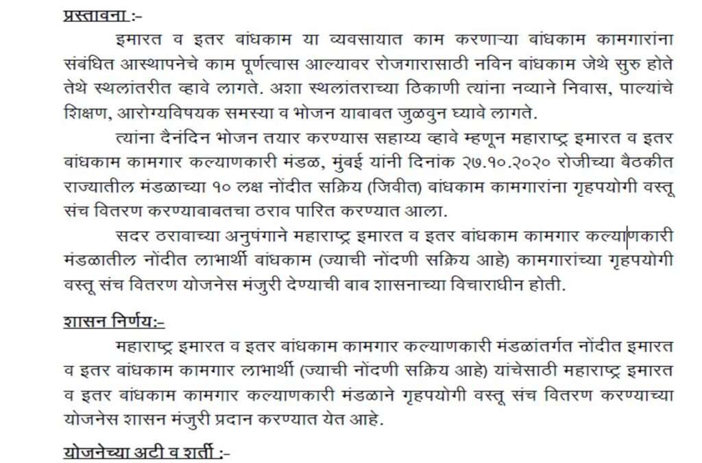 शासन निर्णय : गृह उपयोगिता वस्तु संच वाटप मंजुरी ( बांधकाम कामगार यांना भांडे वाटण्यास मंजुरी )
