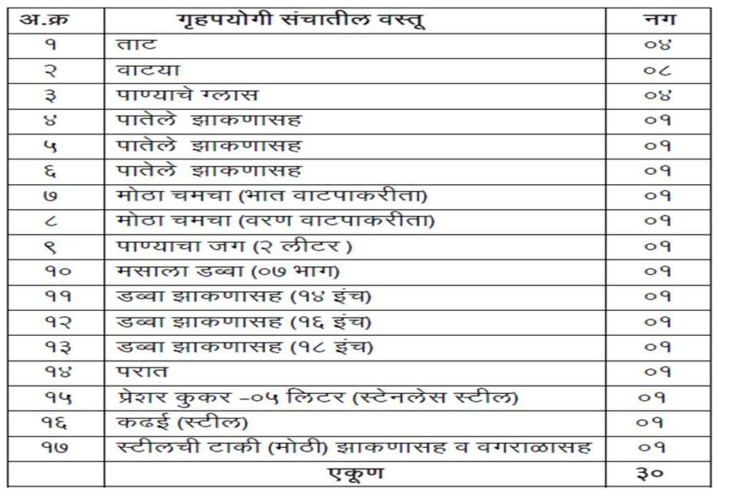 एकूण = 30 नग गृह उपयोगी भांड्याचे साहित्य संच दिले जाणार आहे.
